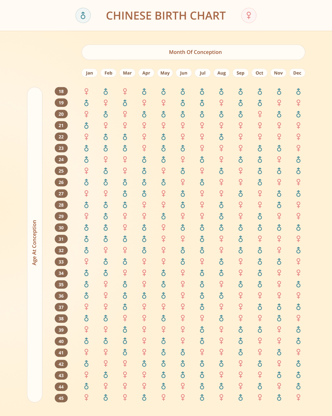 This tool works by taking your age at conception and the month you conceived (based on the Chinese lunar calendar) to make its prediction. When you enter your details into our chinese gender prediction calculator, it uses a traditional chinese gender chart—also known as a gender predictor chart—to show you whether you might have a boy or a girl.