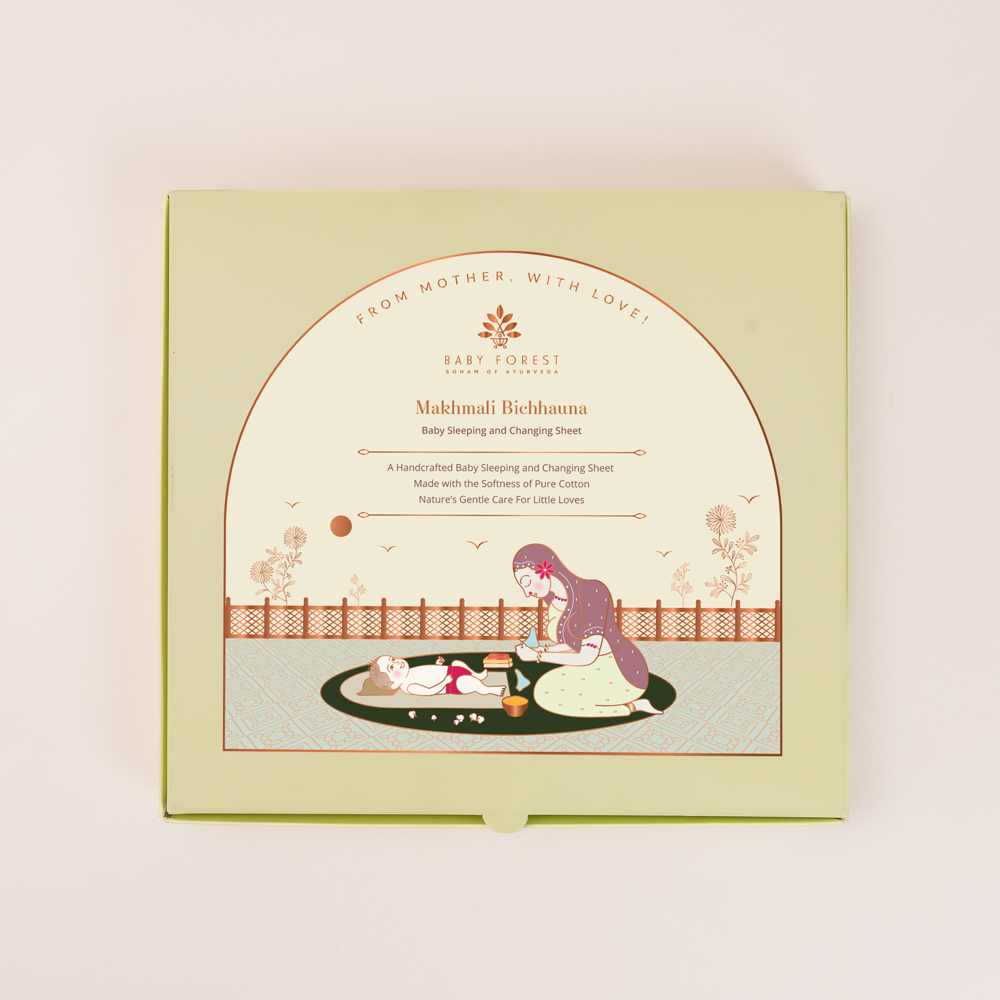 Organic cotton is the best choice as it is soft, breathable, and gentle on sensitive skin. The Makhmali Bichhauna is made entirely of organic cotton, ensuring your baby’s comfort and safety.