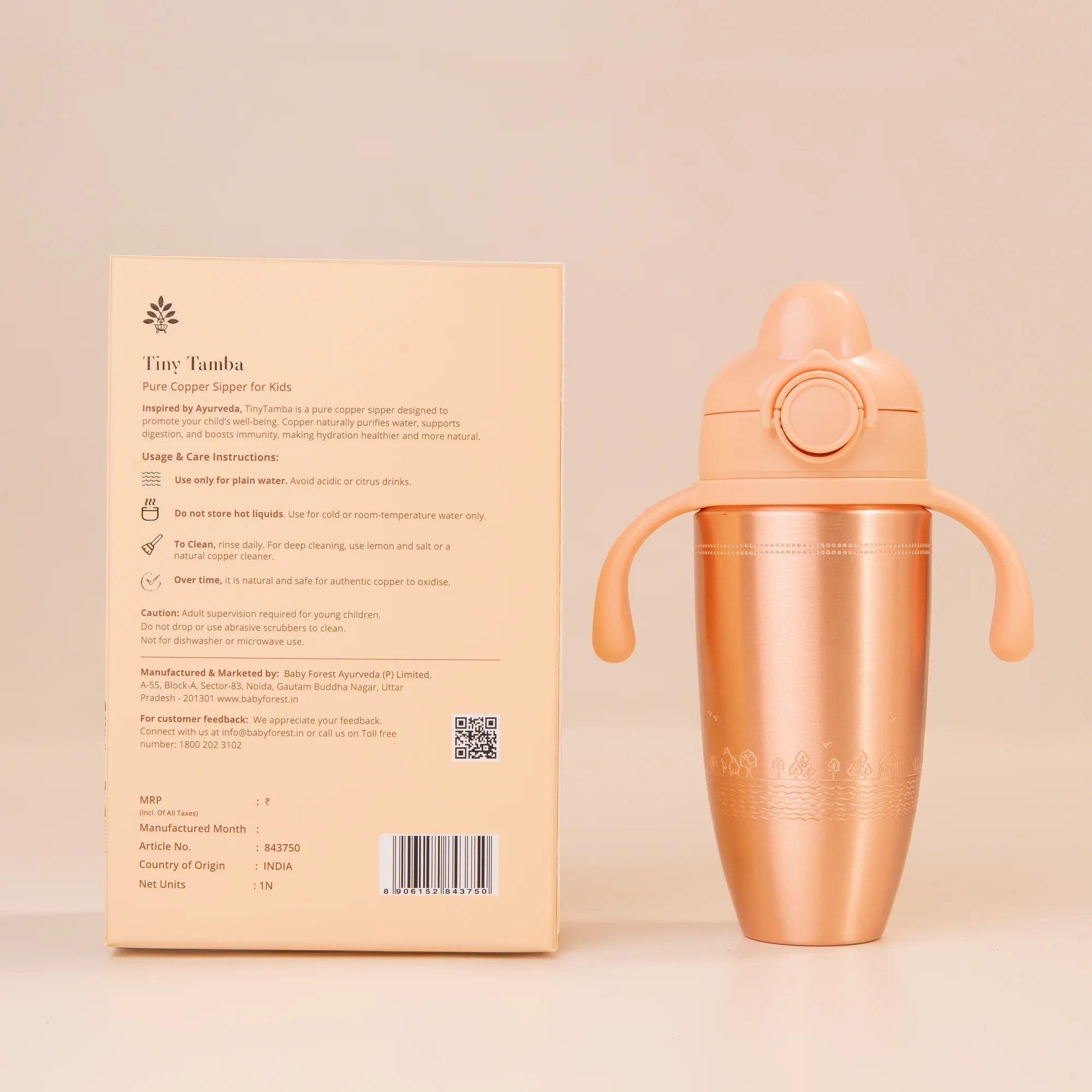 The Nanhi Dawat Brass Dining Set is perfectly safe for serving warm food, as brass retains heat gently without making it unsafe to touch. However, the Tiny Tamba Copper Sipper is designed only for room-temperature or cold water; avoid hot liquids, milk, or citrus-based drinks in it. This ensures your child enjoys the health benefits of copper water safely, every single day.