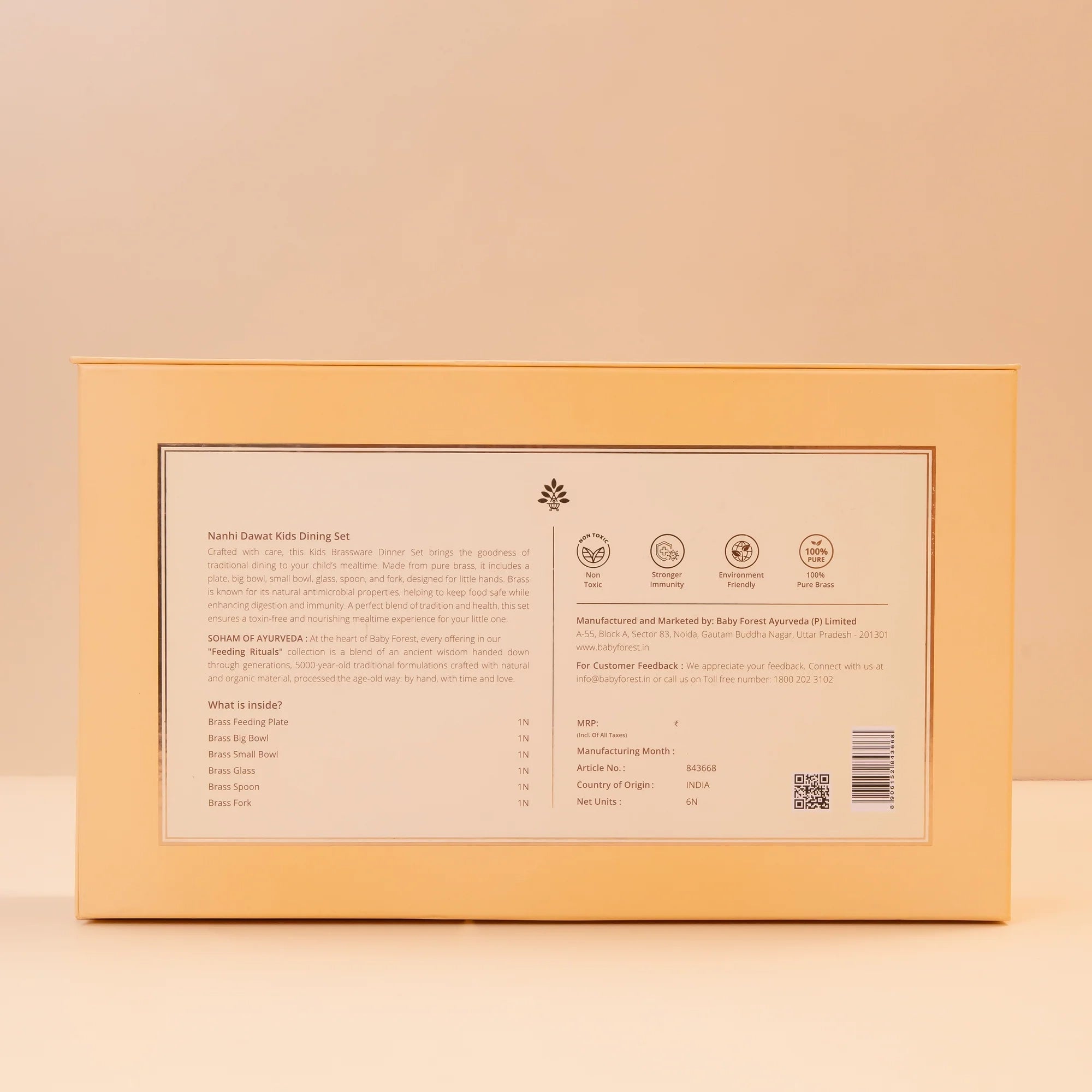 For the Nanhi Dawat Brass Dining Set, wash with a mild cleanser and a soft sponge to prevent scratches. Use our Mridul Patra Baby Dish Cleaner for better results. Dry thoroughly with a soft cloth to avoid water stains. Keep away from harsh cleaners, direct heat, and avoid leaving food in brass for extended periods. Natural tarnishing may occur, reflecting the authenticity of pure brass.