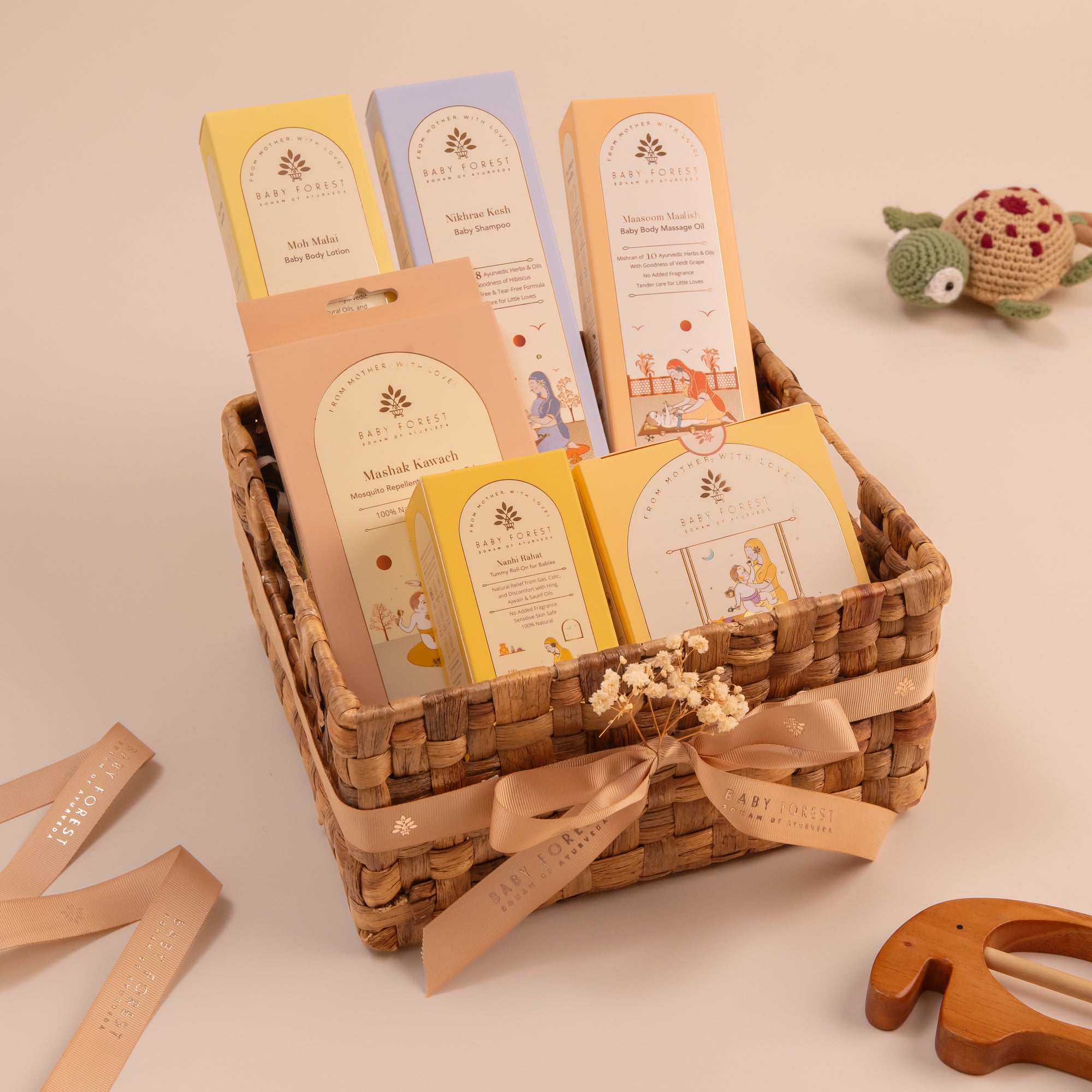 Inside this charming basket, you’ll find six of our best handpicked essentials: Moh Malai Baby Body Lotion, Maasoom Maalish Baby Massage Oil, Nikhrae Kesh Baby Shampoo, Madhur Muskaan Baby Lip Balm, Khilta Mukhra Baby Face Cream, and Mashak Kawach Mosquito Repellent Patches. Each product is crafted to gently care for a baby’s skin, hair, and wellness; all in one thoughtful bundle.