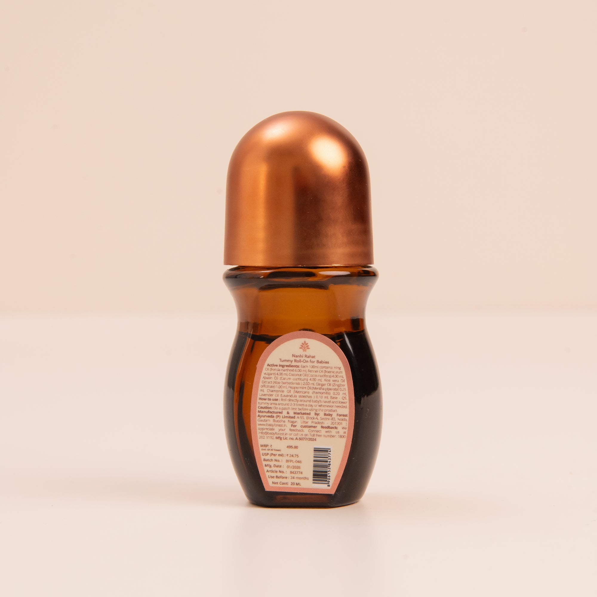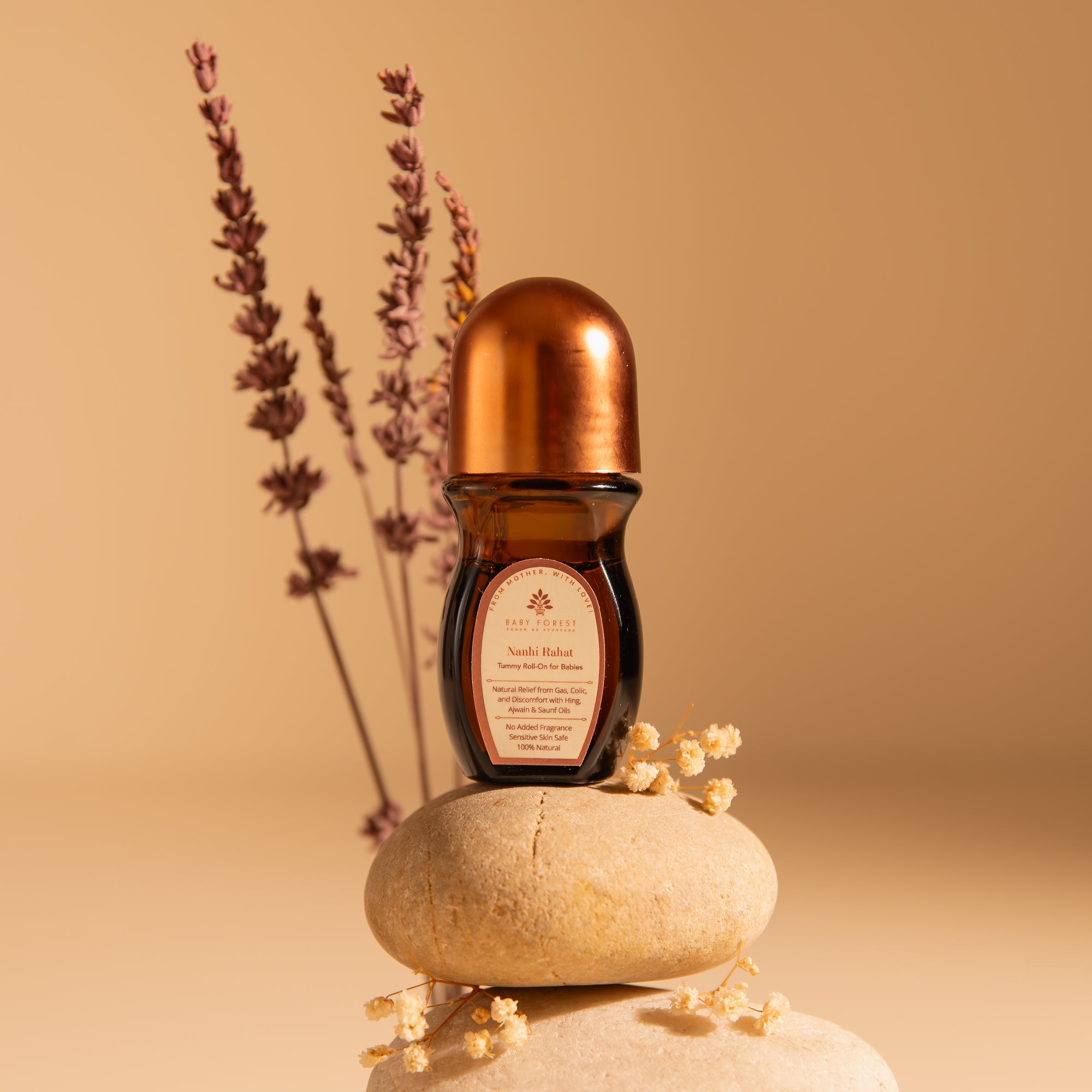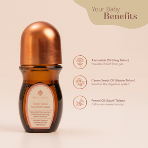 Inspired by Ayurveda, this roll-on is free from harmful chemicals and combines Shunthi Tailam (Ginger), Pudina Tailam (Peppermint), Hingu Tailam (Hing), and other botanical extracts known to naturally support digestion and ease fussiness.